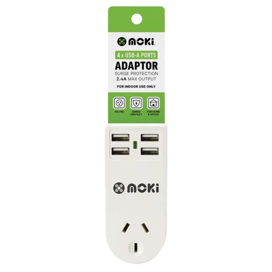 ADAPTOR MOKI ONE SOCKET+4 USB PORTS+SURGE PROTECTION WHT — quality technology available at Better Office Supplies.