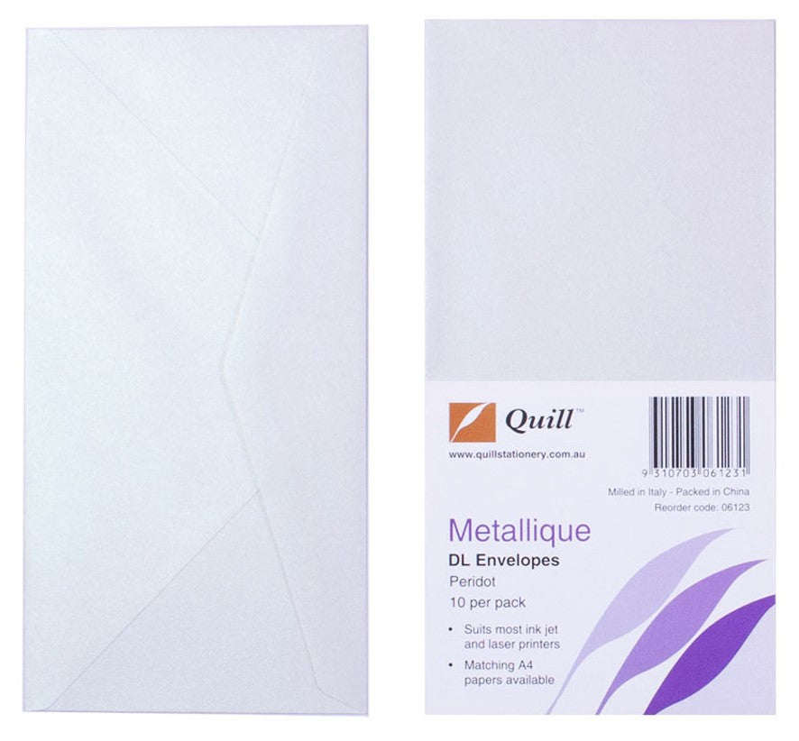ENVELOPES QUILL DL METALLIQUE PERIDOT PK10 — quality office supplies available at Better Office Supplies.
