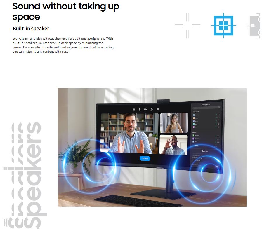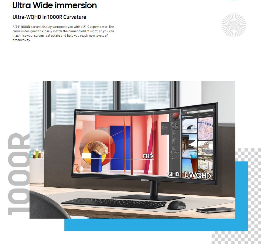 Samsung 34' ViewFinity S50GC UWQHD Ultra 3000:1 100Hz 3440x1440 21:9 5ms 350 cd/㎡ HDR10 VA DP HDMI USB-C Hub LAN Webcam Tilt HAS Swivel VESA 3YR Screen Size (Inches):34' Screen Resolution:3440 x 1440 Resolution Simplified:UWQHD Aspect Ratio:21:9 Screen Panel Type:VA Screen Refresh Rate (Hz):100Hz HDR:HDR10 Adaptive Sync:FreeSync HDMI:1x HDMI 2.0 DisplayPort (DP):1x DisplayPort 1.2 USB Type-C (DisplayPort):1 Height Adjustable:Yes Swivel Adjustable:Yes Tilt Adjustable:Yes Speaker Included:Yes VESA Mounting:100 x 100 Curved:Yes
