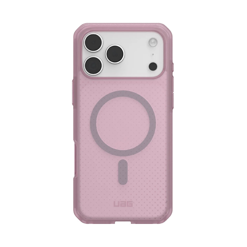 The Dot series is a translucent lightweight case with exceptional military drop protection you trust and love from UAG. Crafted with a rugged co-mold of translucent PC and TPU, it features an advanced impact-resistant core and a raised protective screen surround to guard your device against drops and scratches. Our integrated magnet module locks your device securely in place when using wireless chargers or other magnetic accessories. Features an enhanced textured anti-slip traction grip that ensures a secure hold reducing the chance of accidental drops. Features : MagSafe Compatible: Works with MagSafe compatible wireless chargers and magnetic accessories. Supports Apple Pay. Featherlight and Durable: Lightweight construction with an impact-resistant soft core for reliable protection. Enhanced Impact Resistance: Co-mold construction for added impact absorption. Anti-slip traction grip for daily rugged use. Oversized tactile buttons. 15 ft. Drop Protection: Independently tested to withstand drops up to 15 feet (4.6 meters), ensuring your device remains safe even in the most rugged conditions. Meets Military drop test standards (MIL-SPEC 810G-516.6).Specifications