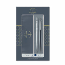 PEN PARKER GIFT SET DUO JOTTER BP & MECH PENCIL S/STEEL CHROME TRIM PK2 — quality office supplies available at Better Office Supplies.